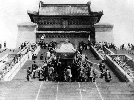 6月1日是“奉安日”。凌晨2時,“總理奉安委員會”特備的汽車已停在國民黨中央黨部二門前院內。奉安總指揮朱培德、總干事孔祥熙以及各組正副主任都已到場,指揮各干事分別做好準備。從凌晨2起,沿中山路兩旁已擠滿送殯的群眾。3時20分,宋慶齡、孫科夫婦及子女、蔣介石夫婦、宋子文夫婦、宋靄齡、楊道儀(朱執(zhí)信夫人)、唐紹儀、陳少白、張繼、葉恭綽、頭山滿、犬養(yǎng)毅、梅屋莊吉、宮崎龍介以及國民黨全體中央委員、國民政府委員、葬事籌備委員、迎櫬專員、各國專使代表等陸續(xù)到達中央黨部禮堂門口等候。4時開始移靈典禮。典禮由胡漢民主祭,由孫中山家屬、親故及國民黨中央委員、國民政府委員、奉安委員、迎櫬專員、葬事籌備委員等恭候靈櫬,總干事孔祥熙執(zhí)旗前導。4時15分,獅子山炮臺開始鳴禮炮一百零一響,靈櫬移出大門,抬上縞素的靈車。汽車的四周扎掛白色彩球,覆蓋黨旗、國旗。靈櫬扶上汽車后,孫中山家屬、親故及各委員、各國專使等即加入第七行列,宋慶齡、陳淑英、孫琬、何香凝、宋美齡、宋靄齡等家屬和女眷在特制黑色布幔內步行出中央黨部禮堂,分乘馬車隨靈護送,其余男賓則分左右兩列分別執(zhí)紼步送。4時25分,號兵吹起啟行號,靈車啟動。軍校學生200余名為護靈團,全副武裝,分列兩側,隨行護衛(wèi)。鐵甲車及騎兵連在前面開道,由一名騎兵長官騎黑馬,手執(zhí)開道旗。送殯各機關團體共分十行列,在事先指定的地點依次加入,隊伍長達五六里,朱培德任總指揮,姚琮、谷正倫、張治中分任各有關行列指揮。
