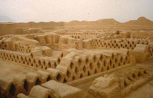 昌昌古跡位于太平洋海岸,是奇穆文明(Chimúcivilization)的首都。奇穆文明大約始于公元850年,消亡于1470年。土城城區(qū)是帝國的權(quán)力中心,帝國從厄瓜多爾南部延伸到秘魯中部,綿延1000多公里。15世紀(jì)時城市的居民達(dá)6萬人,大部分是工人,服務(wù)于極權(quán)君主,還有高級手藝人和神父。那是個嚴(yán)格的世襲等級社會:奇穆神話說,太陽用三個蛋創(chuàng)造了人類,金蛋孵出了統(tǒng)治者,銀蛋孵出了統(tǒng)治者的妻子,銅蛋孵出的是大眾。