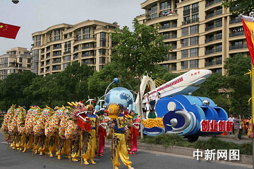 中新網(wǎng)杭州9月26日電(記者 汪恩民 袁爽 實習生 甘小虎)今天,在“浙江省慶祝新中國成立60周年文藝巡游活動”上,彩車斗艷,浙江各地市紛紛以獨具特色的民間藝術(shù)獻禮祖國六十年壽辰。