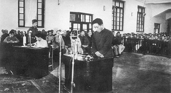 為了這次出庭,王克峰頭一次穿上整潔的灰色毛料中山裝、黑皮鞋,拎的是米黃色皮包,在法庭上接受公訴人、審判長、辯護人、被告人的質疑詢問,以鑒定證據支持公訴。整個過程,都用電影膠片給記錄了下來。被告人住岡義一當庭認罪,請求審判長“給我最嚴重處分”。