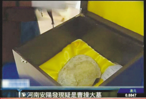 “這個(gè)墓里,發(fā)現(xiàn)石璧三個(gè),圭一個(gè)。圭壁合一,是判斷一個(gè)帝王陵墓等級(jí)級(jí)別的一個(gè)非常重要的標(biāo)準(zhǔn)!必(fù)責(zé)挖掘工作的河南省文物考古研究所副研究員、考古隊(duì)隊(duì)長(zhǎng)潘偉斌說(shuō)。據(jù)介紹,除上述器物外,該墓還出土有大量畫(huà)像石殘塊。這批畫(huà)像石畫(huà)工精細(xì)嫻熟,雕刻精美,內(nèi)容豐富,有“神獸”、“七女復(fù)仇”等圖案,并刻有“主簿車”、“咸陽(yáng)令”、“紀(jì)梁”、“侍郎”、“宋王車”、“文王十子”等文字,堪稱精品。在墓室清理中,發(fā)現(xiàn)有人頭骨、肢骨等部分遺骨,專家初步鑒定為一男兩女3個(gè)個(gè)體,其中墓主人為男性,年齡在60歲左右,與曹操的卒年66歲相吻合。經(jīng)研究,認(rèn)定這座東漢大墓為文獻(xiàn)中記載的魏武王曹操高陵。