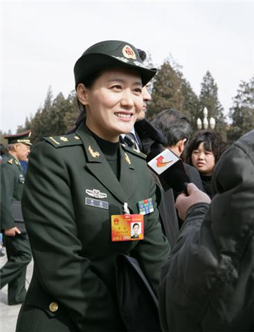 3月8日上午,參加十一屆全國(guó)人大三次會(huì)議的解放軍代表譚晶被男記者包圍采訪。 中新社發(fā) 張宇 攝