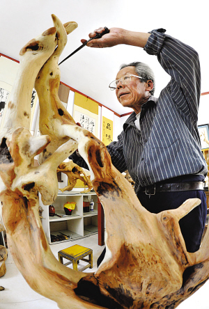 昨天,連云港被稱為“農(nóng)民根雕藝術(shù)家”的金同柱,正在家中創(chuàng)作根雕藝術(shù)品“兩岸同根”。 金同柱癡迷根雕藝術(shù)10多年來,創(chuàng)作了100多件根雕藝術(shù)品,多次在各類比賽中獲獎,其中以中國第一顆原子彈爆炸成功為題材的根雕藝術(shù)品“中國第一爆”,在農(nóng)民根雕比賽中獲得了一等獎!