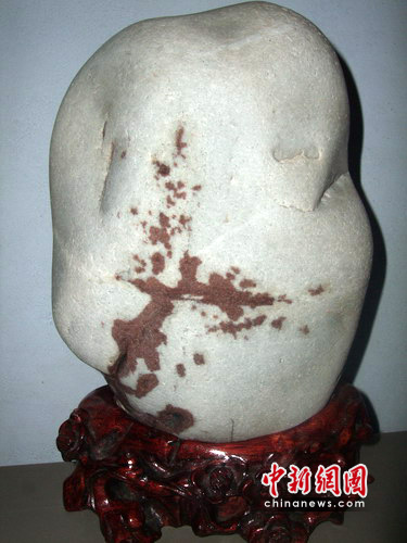 記者細(xì)細(xì)觀賞,該石頭18厘米,高24厘米。石頭通體純白晶瑩,在該石頭右下角,一樹紅紅的梅花伸出頭來,在“冰雪”里傲然怒放,斗雪吐艷,玉樹臨風(fēng),真是“萬花敢向雪中出,一樹獨(dú)先天下春!痹撌^圖案中,樹干、樹枝輪廓清晰,樹干、樹枝、花朵均為暗紅色,暗紅色的梅花花朵成形,遠(yuǎn)看疏影清雅,花色美秀。