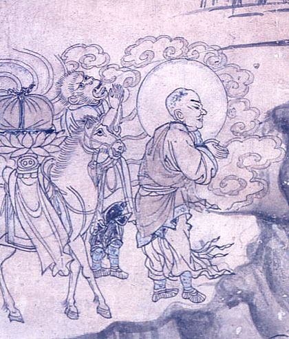 根據(jù)壁畫中所描繪的內(nèi)容,在此之前,一些專家已經(jīng)將這些圖像確定為唐玄奘取經(jīng)圖,雙手合十的出家人是玄奘,猴相弟子是孫悟空,馬是玄奘的隨行坐騎。