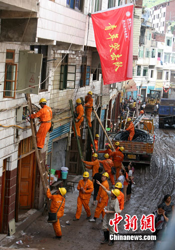 洪災(zāi)過后,江陵鎮(zhèn)熱浪逼人,但在街道上確是一派熱火朝天的場(chǎng)面,氣溫一直持續(xù)38℃以上的高溫,為了讓江陵鎮(zhèn)的受災(zāi)群眾能及時(shí)用上電,成都電業(yè)局抗洪搶險(xiǎn)突擊隊(duì)員們頂著炎炎烈日,揮汗如雨,認(rèn)真地按照標(biāo)準(zhǔn)規(guī)范架設(shè)著每根電纜線。