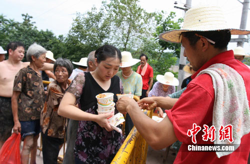 中新網(wǎng)廣安7月22日電( 廖小兵 劉長河)在剛剛遭受160年未遇的特大洪災(zāi)中,四川省廣安區(qū)肖溪鎮(zhèn)老街被整體淹滅,街道清淤還未結(jié)束,1000余人無家可歸。目前災(zāi)民生活得怎么樣?22日中午12時(shí)許,記者來到肖溪鎮(zhèn)中心街下段的災(zāi)民集中安置點(diǎn),只見兩排帳篷整齊地排列,在第三號(hào)帳篷,災(zāi)民杜超華一家正在吃著香噴噴的盒飯。“洪水來得太猛了。比三年前的洪災(zāi)高了2米多,我家的東西全部被洪水沖走了。幸虧黨委政府及時(shí)伸出了援手,給我們搭建了帳篷,購置了被褥,免費(fèi)提供一日三餐。晚上還給我們送來了蚊香。盡管受了災(zāi),有了黨委政府的關(guān)愛,我們的家園一定會(huì)迅速重建起來!
