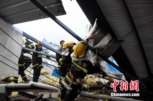 重慶長(zhǎng)壽消防支隊(duì)透露,當(dāng)晚18時(shí)30分許,該支隊(duì)119指揮中心報(bào)警電話(huà)聲不斷。“快、快,新市鎮(zhèn)有廠(chǎng)房被吹垮了,你們119快來(lái)呀!”接到報(bào)警后,重慶長(zhǎng)壽消防支隊(duì)迅速調(diào)集30名官兵攜帶搶險(xiǎn)救援工具奔赴現(xiàn)場(chǎng)救援。當(dāng)?shù)卣、公安等部門(mén)領(lǐng)導(dǎo)也及時(shí)趕到現(xiàn)場(chǎng),協(xié)助和指揮救援工作。