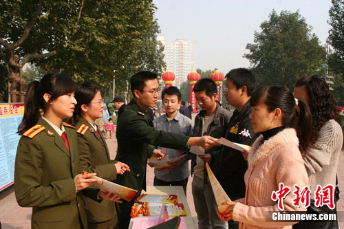 中新網(wǎng)鄭州10月24日電(胡影 馬昕 馬濤)“兩年后還想繼續(xù)在部隊(duì)干,有啥優(yōu)惠政策?”“大三學(xué)生能報(bào)名嗎?”10月23日上午,鄭州市首個(gè)征兵宣傳日活動(dòng)現(xiàn)場(chǎng),紛至沓來(lái)的高校學(xué)子紛紛就今冬征兵政策問(wèn)東問(wèn)西。親臨現(xiàn)場(chǎng)的鄭州市委常委、市征兵領(lǐng)導(dǎo)小組副組長(zhǎng)、警備區(qū)政委劉貴新,市征兵領(lǐng)導(dǎo)小組副組長(zhǎng)、警備區(qū)參謀長(zhǎng)李國(guó)記忙不迭地一一進(jìn)行解答。