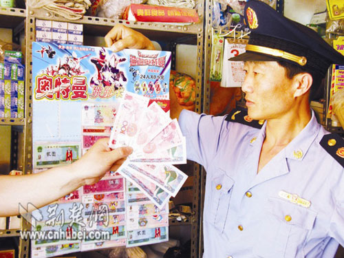 隨即,工商執(zhí)法人員趕到學校附近的幾家商店檢查,發(fā)現(xiàn)了小凱所說的這種兒童玩具。這種玩具是將人民幣圖案印在銅版紙上,并印有編號,形同真幣。整套玩具中夾帶兩本名為《奧運錢幣存折一本通》的游戲存折,其上印有賬號和北京奧運2008等字樣。