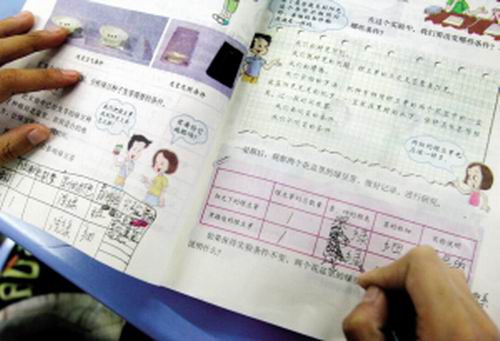 參與調(diào)查的同學(xué)韓迪聰介紹說,調(diào)查發(fā)現(xiàn)同學(xué)們在循環(huán)使用教科書時,因為不能在上面寫字填空了,就需要準備一個本子,抄寫教科書上需要填寫的內(nèi)容。比如說《科學(xué)》,里面就有一些實驗報告,同學(xué)們或者把報告填寫部分抄下來,或者是自己復(fù)印,要不就是只聽課,不做題了。