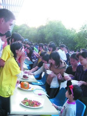 現(xiàn)場烹飪比賽結(jié)束后,各參賽隊伍把自己的成品展示在一排長長的桌子上,F(xiàn)場學(xué)生排起了數(shù)十米長的隊伍,人手一只碗,一雙筷,擺好陣勢沖著美食長龍開始了“掃蕩”!捌呃镲h香”雞翅,“盛世金蘭”南瓜煲......各位學(xué)生大廚一邊介紹一邊拉票,場面熱鬧非凡。 (記者 薛冰 實習(xí)生 林珍 通訊員 何淑賢)