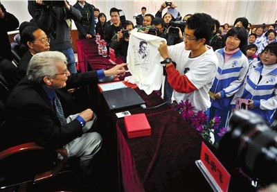 昨天(11月11日,下同)上午,2008諾貝爾獎(jiǎng)獲得者北京論壇在人民大會(huì)堂開(kāi)幕,7位諾貝爾獎(jiǎng)獲得者和4位圖靈獎(jiǎng)獲得者來(lái)京論道。當(dāng)天下午,兩位諾獎(jiǎng)得主分別前往三帆中學(xué)和北京理工大學(xué),和大中學(xué)生們面對(duì)面交流。三帆中學(xué)每個(gè)班級(jí)都提前制作了立志信物贈(zèng)送給大師。