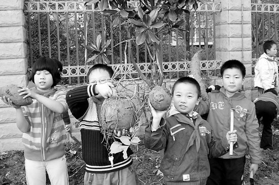 孩子們挖上來的番薯不但數(shù)量和體積相當(dāng)驚人,連形狀也是千奇百怪。除了經(jīng)常能見到的長形的、橢圓形的番薯外,還有圓滾滾的,甚至是波浪形的,孩子們給這些番薯都取了名字,“絲瓜番薯”、“方便面番薯”,當(dāng)然,最大的“番薯王”也有名字,叫做“地雷”。