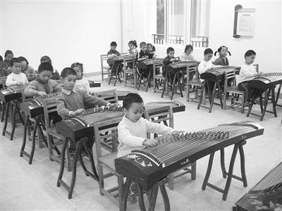 11 月13日,記者在漢陽玫瑰園小學南國明珠校區(qū)古箏室看到:一年級一班31個孩子(包括17名男生),在專聘老師的指導下,有模有樣彈著古箏。音樂老師指著坐窗口的一個小男生介紹說:“他叫小杰,可以說是最調皮的孩子了,但只要一上古箏課他就特別安靜而且好學,他都能完整彈好幾首曲子了呢!”