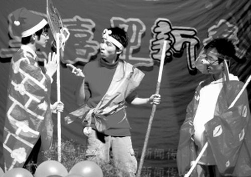 “幾天前,校園里就貼出了由文學(xué)院學(xué)生自編自導(dǎo)自演的山寨版《西游記》即將開演的消息,我們都是慕名而來,倒要看看這部所謂的“山寨劇”到底能把原著‘糟踐’到什么程度!庇⒄Z專業(yè)的劉同學(xué)說。