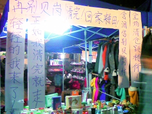 只見高高掛著的白色橫幅“再別貝崗,清完回家耕田”幾個字格外醒目,再加上“輕輕的我來了,正如我清完就走”、“含淚告別貝崗村,全場清倉跳樓價(jià)”兩幅對聯(lián)。而“靈堂”下的“祭品”卻是各種名牌護(hù)膚品。對此,不少人學(xué)生表示很迷惑:“怎么是白色對聯(lián)呀,應(yīng)該用紅色才對吧?”隔壁攤位的老板極盡挖苦地說:“好像死了一家人,等著些錢買棺材似的!倍摗办`堂”的“堂主”,竟是來自華工的高才生,“因?yàn)闆]有機(jī)會外出去實(shí)習(xí),我們就通過這樣的方式來磨練自己。我們的樣子都這么慘了,大家一動心就會買的!眱蓚男生強(qiáng)調(diào),做市場營銷這一行,需要承受很多異樣的目光和心理壓力,這對他們來說是極大的鍛煉。