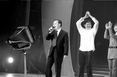 略顯緊張的周校長“喝口水”的要求得到滿足后,便從衣袋里掏出一張寫有歌詞的白紙,正式開唱。他手握麥克風,緊盯臺上的卡拉OK屏幕,高潮處他還會踮起腳尖“飆高音”。此時,上任校長許智宏微笑著坐在臺下,隨聲輕和。