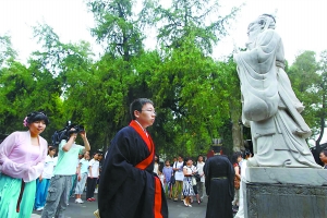 本報(bào)訊 今天上午,孔廟大成門(mén)下、孔子像前,孔廟和國(guó)子監(jiān)博物館首屆“成人傳統(tǒng)禮儀”在這里隆重舉行,包括2009年北京高考文理科狀元?jiǎng)⑼ッ、寧少?yáng)在內(nèi)的160多名學(xué)生參加活動(dòng),然而主辦方和媒體過(guò)分關(guān)注臺(tái)上兩位狀元的一舉一動(dòng),讓臺(tái)下的學(xué)生備受冷落。