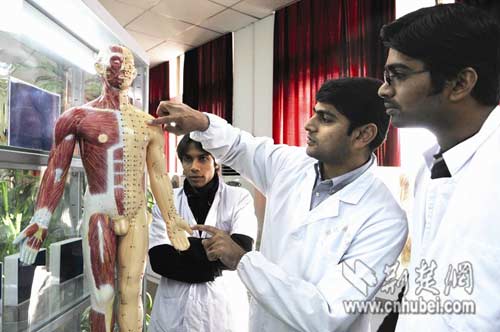 湖北中醫(yī)學(xué)院是教育部首批批準(zhǔn)的接受留學(xué)生的院校之一。目前,在該院海外教育學(xué)院,已有來(lái)自20多個(gè)國(guó)家和地區(qū)的“洋學(xué)生”,他們用不同的語(yǔ)言,解讀著對(duì)他們來(lái)說(shuō)極其神秘的中華文明。