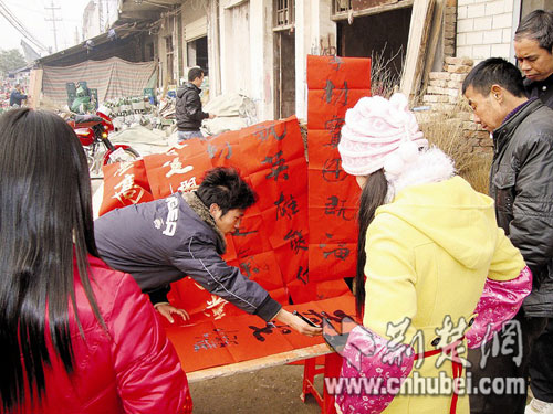 昨日上午,成家良開(kāi)始擺攤賣(mài)春聯(lián),不一會(huì)兒就引來(lái)了不少?lài)^的人。一名小伙子花了10元錢(qián)買(mǎi)下一副火星文春聯(lián),他說(shuō),成家良賣(mài)的是非主流春聯(lián),夠創(chuàng)意,但“不知道家里人能不能接受”。也有圍觀的老人不贊同成家良的創(chuàng)意:“他對(duì)書(shū)法的精髓還沒(méi)有完全掌握好,就想著去創(chuàng)新,未免太心急了!