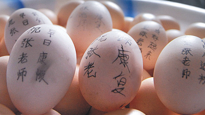 由于戴著口罩上課,張老師為讓學(xué)生們能夠聽清楚,經(jīng)常一句話要重復(fù)兩三遍,一堂課下來常常累得口干舌燥。即使是這樣,張小林仍然一直堅(jiān)持著?粗鴱埨蠋煷髦懊婢摺鄙险n,初二一班的同學(xué)們悄悄湊了130個(gè)雞蛋,每個(gè)雞蛋上都寫著:“張老師,祝你早日康復(fù)!”“張老師,快點(diǎn)好吧”……學(xué)生余南瀾說,在班干部提議下,同學(xué)們每人拿兩個(gè)雞蛋送給張老師,一是祝福他,二是希望能為他補(bǔ)充營養(yǎng)。