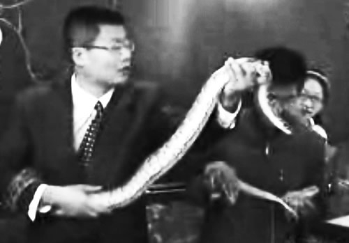 將一條長達(dá)2米多、重達(dá)5公斤的蟒蛇抱到課堂上當(dāng)“模特”,教學(xué)生學(xué)習(xí)動(dòng)物寫生的技巧。武漢市第五十九中教師鄒華章抱蟒蛇上課的視頻,近日在網(wǎng)絡(luò)上瘋傳。從10月27日上網(wǎng)到昨日,共有400多個(gè)網(wǎng)站轉(zhuǎn)載這一視頻,其中在一家網(wǎng)站的點(diǎn)擊率已高達(dá)12.6萬人次。