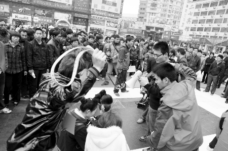 河南商報(bào)報(bào)道因發(fā)帖指責(zé)鄭州艾迪美文化傳媒有限公司(以下簡(jiǎn)稱艾迪美公司)不退還押金,是個(gè)“騙子”,4月7日,發(fā)帖者稱遭到了該公司人員皮帶抽、拳頭打的噩運(yùn)。昨天,發(fā)帖者和部分受害者在二七廣場(chǎng)聚會(huì),以“行為藝術(shù)”再現(xiàn)艾迪美公司打人的場(chǎng)景。