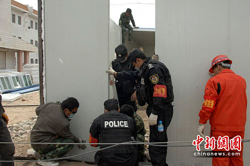 當(dāng)天下午,由成都公安特警30名青年民警組成的突擊隊(duì)與建材集團(tuán)員工一起先用挖土機(jī)將地面推平,然后隊(duì)員們分工合作、用帶來的發(fā)電機(jī)迅速發(fā)電,有的切割泡沫板,有的在鋼板上鉆孔,有的拼接泡沫墻面,在“5.12”抗震救災(zāi)時掌握的“施工技術(shù)”在這兒全用上了。這時的天空又一次飄起了雨夾雪,寒氣襲人,但特警隊(duì)員們?nèi)匀桓蓜攀。由于高原缺氧,一名?duì)員在劇烈搬送后出現(xiàn)了頭暈癥狀,其他隊(duì)員馬上將他扶到一旁休息,另一名隊(duì)員立即替補(bǔ)上去,他們就這樣輪番著作戰(zhàn)。在拼接板墻的時候,由于風(fēng)沙很大,隊(duì)員們眼睛、嘴里全是沙,但他們顧不了那么多,心中只有一個信念:就是以最快速度將板房建好,讓災(zāi)區(qū)的同學(xué)們早日復(fù)課,參加學(xué)習(xí)。