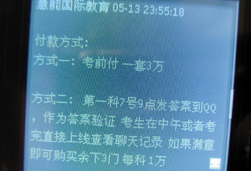 稍早前,徐杰在一個(gè)頗有人氣的高考吧里發(fā)帖時(shí)被賣“高考答案”的人盯上了,這個(gè)叫“慧能國(guó)際教育”的QQ號(hào),其簽名檔寫著:“高考考前答案已發(fā)出,請(qǐng)各位客戶收到后立即回復(fù)索取解鎖密碼!”徐杰說,對(duì)方開門見山告訴他,能搞到今年高考試題答案,而且是第一手的。為了讓徐杰相信,賣家稱第一科可在7日上午9時(shí)發(fā)答案到其QQ上,作為答案驗(yàn)證,考生在中午或考完直接上線查看聊天記錄,如果滿意,可購(gòu)買余下幾門考題和答案,每門1萬元。如果考生在考前付錢,全套3萬元,考題和答案會(huì)在考前一天下午2時(shí)準(zhǔn)時(shí)發(fā)到其郵箱(見右圖)。賣家還聲稱,考卷是掃描版的,答案是特級(jí)教師和高級(jí)教授做出的,準(zhǔn)確率在95%以上。按照賣家的說法,只要花重金,考生“包二本以上力爭(zhēng)一本”,就可讀上理想中的大學(xué)。
