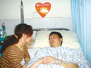 地震被埋的北川中學(xué)教師楊漢德,病床上一直自責(zé)沒能參與搶救自己的學(xué)生。“到醫(yī)院兩天了,他一直不愿說話!弊蛳挛,西郊醫(yī)院外二科病房,院長陳和平為傷員楊漢德遞上了慰問金,守候在病床前的妻子張鈺,看著表情木然的楊漢德,也不禁黯然神傷。