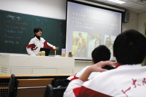 據(jù)了解,人大附中高中部開設(shè)的“主題電影欣賞”選修課,從組織到授課,都是由5名高中生全程承擔(dān)。這些熱愛(ài)電影、能力突出的高中生從暑假起便精心制訂教學(xué)計(jì)劃、寫教案、剪輯影片、做PPT。五名高中生的創(chuàng)舉贏得了選課同學(xué)的好奇和贊許。圖為一名學(xué)生在用幻燈講授電影欣賞知識(shí)。記者 羅德宏 實(shí)習(xí)生 王靜怡/文