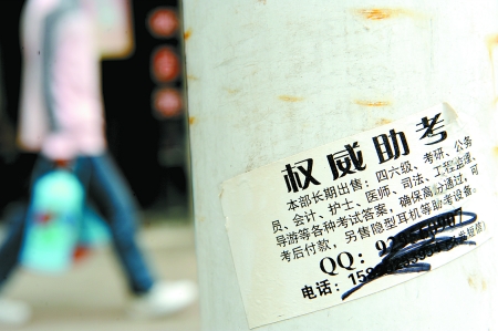 而監(jiān)考過研究生考試、公務(wù)員考試的婁老師則表示,由于參加這類考試的群體心理比較成熟,在他們使用作弊工具過程中,并不容易對付。婁老師說,盡管在考場上并沒發(fā)現(xiàn)大規(guī)?忌鞅,考試后不少試卷答案的雷同問題說明,作弊的考生大量存在。至于是如何成功作弊的,在沒有當(dāng)場抓住的情況下不好說。