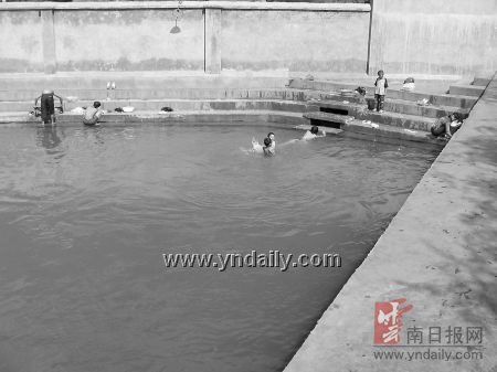 滇南武校內(nèi)有一個游泳池,但多年未用,泳池成了學(xué)生晾曬衣服的場地。游泳池的南側(cè)還有一池子,池內(nèi)的水就是從校外公路邊引來的龍?zhí)端。池子的北面是走道,地面高出水面約150厘米。池子的東、南、西3面都有臺階下到池底,學(xué)生們可以在這里洗衣服,當(dāng)然,練武的學(xué)生們也會在課后站到不深的池內(nèi)擦擦身子。