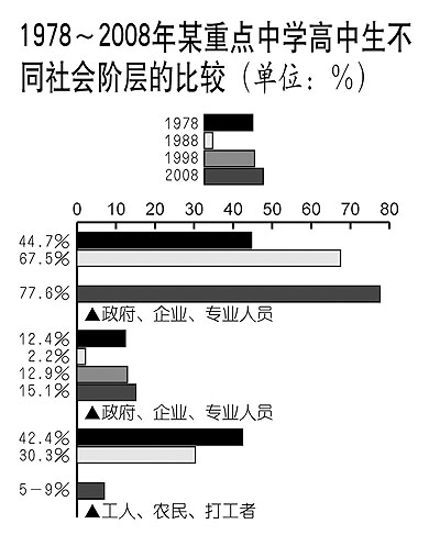 通過簡單的數(shù)學運算,我們可以看到,來自私營企業(yè)主家庭的學生在重點高中生中所占比例為11.79%,明顯高于他們在社會總體(0.54%)中所占的比例,高出了11.25個百分點,個體工商戶的所占比例也高出了9.57%,經(jīng)理人員階層的所占比例高出了9.13%。