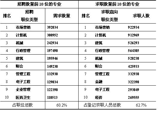 計算機(jī)、市場營銷、機(jī)械、行政管理、建筑等專業(yè)是人才市場招聘的熱點,求職人員主要集中在這五個專業(yè)。