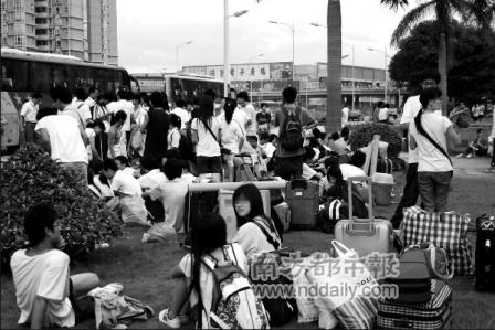 前天下午6時(shí)許,記者趕到松崗文化廣場,仍然有100多名學(xué)生滯留在那里。其中一個(gè)學(xué)生告訴記者,他們來自廣東輕工職業(yè)技術(shù)學(xué)院,這次共有300多名大一和大二的學(xué)生來深圳打暑期工。同學(xué)們每人交了100元包車費(fèi),早上從廣州出發(fā),中午11點(diǎn)多到松崗,卻被廠方告知人員已經(jīng)招滿。