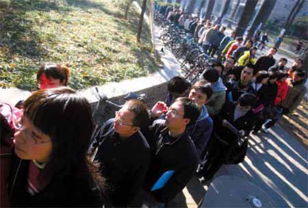 昨日(20日,下同)上午,清華大學(xué),求職學(xué)生在招聘現(xiàn)場門外排起長隊。因人數(shù)較多,校方一度限制學(xué)生進場。到11時,隊伍超過兩百米。本報記者 薛珺 攝