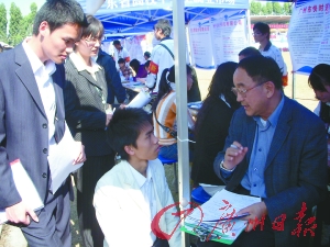 在一家生產(chǎn)和銷售模型零配件的公司攤位前,一群人圍在一位長者跟前。長者是這家模型公司的主管,公司要招機械設計制造、會計、物流管理等崗位7人,但排了長長的一條隊。長者戴著眼鏡,手里握著筆,一邊與應聘者和風細雨地聊,一邊在簡歷上圈圈畫畫。來自南華工商學院物流專業(yè)的楊同學半蹲在長者面前,足足面試了15分鐘。事后楊同學說:“他讓我對倉庫的整個流程做一個設計,寫成一個報告,一星期內(nèi)發(fā)郵件給他! 接下來的一位女孩面試,長者問她可不可以做倉務,女孩表示可以;長者又問每天要提15公斤東西上下樓100次能否承受,女孩勉強表示可以;長者又告訴她公司的工作時間長,可能沒時間談戀愛怎么辦?女孩一時語塞。