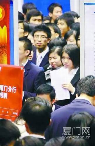 當(dāng)日在廈大召開的畢業(yè)生招聘會,是廈大每年為自己的畢業(yè)生舉辦的,不過,幾乎省內(nèi)的大學(xué)都有人趕去參加,使得廈大這一年一度的招聘會首次實(shí)行門禁——依照人流量分時段放人入場,有的畢業(yè)生花了一小時才遞上一份簡歷。