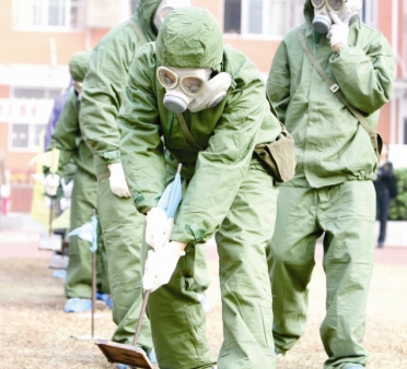 16:15 10名學(xué)生穿著防化服,拿著各種儀器小心謹(jǐn)慎地穿越染毒區(qū)并用白、黃、藍(lán)三中顏色標(biāo)明沾染區(qū)和非沾染區(qū),以便人們安全通過(guò)。接著,有8名學(xué)生安全通過(guò)了沾染區(qū)。