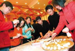 精彩的演出結(jié)束后,所有參加活動的學(xué)生們一起包餃子。因為不少學(xué)生是南方人,包餃子并不在行,餃子的模樣也是五花八門,等餃子煮出來更是皮和餡兒都分了家,大家一邊吃一邊笑,心情很愉快。在南大讀大二的毛靜是個靦腆的重慶姑娘,不愛說話的她也被現(xiàn)場快樂的氣氛感染了,開心地有說有笑,她說,自己家的經(jīng)濟條件不是很好,又加上下大雪,就沒有回家。自己是個特別內(nèi)向的人,本來以為會度過一個寂寞的假期,但是,豐富的活動和周圍眾多的朋友讓她感到了家一樣的幸福。