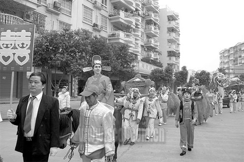 23日上午,數(shù)十名身著中國傳統(tǒng)服飾的婚禮隊(duì)伍早早等在西河北路一宿舍小區(qū)。十多名男女扛著木牌,上寫“鐘愛一生”、“喜結(jié)良緣”之類吉辭。兩只彩獅,一條長龍,排在隊(duì)伍當(dāng)中。而近20輛人力三輪車,載著新郎、新娘的親屬,跟隨在隊(duì)伍后面。