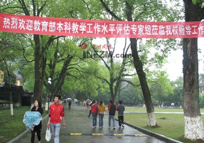 各種迎評的紅幅掛在教學樓或者人行道上,每幢教學樓門口都豎著倒計時牌,標記著這是評估前的最后一天。學生會成員站在教學樓門口檢查校徽。校園110們穿著嶄新的保安制服,騎著摩托車在四處巡邏,據(jù)說為了迎評,添置了不少人手。隨便找個什么人聊天,開口閉口談的都是“評估”。連和校內的小店老板攀談,他也在說評估:“對面那家店,是為了迎評新開的……”