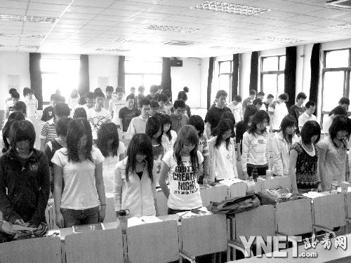 教室里、大禮堂、宿舍樓、辦公室、實(shí)驗(yàn)室……昨天下午14點(diǎn)28分,北京各高校凡是有學(xué)生和老師的場所,都成為師生為四川災(zāi)區(qū)死難同胞默哀的地方。清華大學(xué)昨天開通了所有教室的廣播,廣播連通了中央人民廣播電臺(tái)。隨著那一聲尖銳而悠長的鳴響劃破天空,清華第一教學(xué)樓101教室正在上課的100多名同學(xué)站起來,共同為災(zāi)區(qū)死難者默哀,主講老師黃成英教授打開了他特意準(zhǔn)備的PPT頁面。