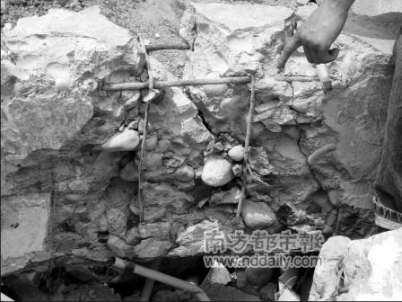 除此,教室的承重梁是由鋼筋混凝土澆灌的,但里面充斥各種碎磚塊、木頭等雜物!盎炷脸煞植桓蓛簦秃孟裎覀兂缘拿子猩匙右粯!毙苡篮辣扔鞯卣f(shuō),這樣的房梁無(wú)法承重。