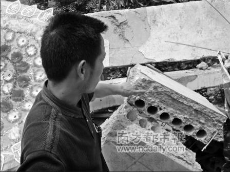 熊永豪認(rèn)為,除了設(shè)計(jì)上的先天不足,教學(xué)樓在后期施工中,也存在不少隱患。站在廢墟上,他隨手撿起一塊磚頭,上面光滑平整,幾乎沒(méi)有粘著水泥!斑@表明兩個(gè)問(wèn)題,可能是水泥的標(biāo)號(hào)不夠,或者是涂在磚上沙灰飽和度不夠!毙苡篮勒f(shuō)。