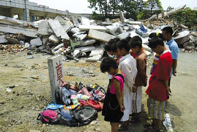 “5·12 ”地震發(fā)生后,四川德陽(yáng)什邡市一名從廢墟中爬出來(lái)的13歲小孩,曾英勇救出3名同學(xué)和一名懷孕教師。昨天,該少年來(lái)到學(xué)校倒塌的校舍里刨出10余個(gè)書(shū)包,將它們整整齊齊地?cái)[放在廢墟旁邊一塊寫有“奠”字的碑前,然后與其他同學(xué)一道默哀3分鐘,以此方式來(lái)陪伴遇難的同學(xué)一起過(guò)兒童節(jié)。