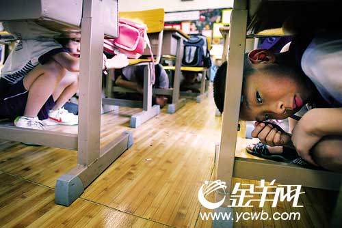 “鈴———!”正在上課,警鈴大作。在老師指揮下,所有孩子立刻蹲到書(shū)桌下,用書(shū)包或雙手護(hù)頭。稍?xún)A,情勢(shì)較為穩(wěn)定后,孩子們立刻在老師的護(hù)送下疾步下樓,在空曠的操場(chǎng)上集合,或蹲或坐,繼續(xù)用手護(hù)頭。