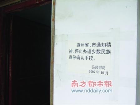 在民宗局辦公室的門口處,張貼著落款為“2007年10月”的一份告示,“遵照省、市通知精神,停止辦理少數(shù)民族身份確認(rèn)手續(xù)!迸砹f,這是因?yàn)檎宜齻冝k民族變更手續(xù)的人很多,“很煩,就在門口貼了這張公告!
